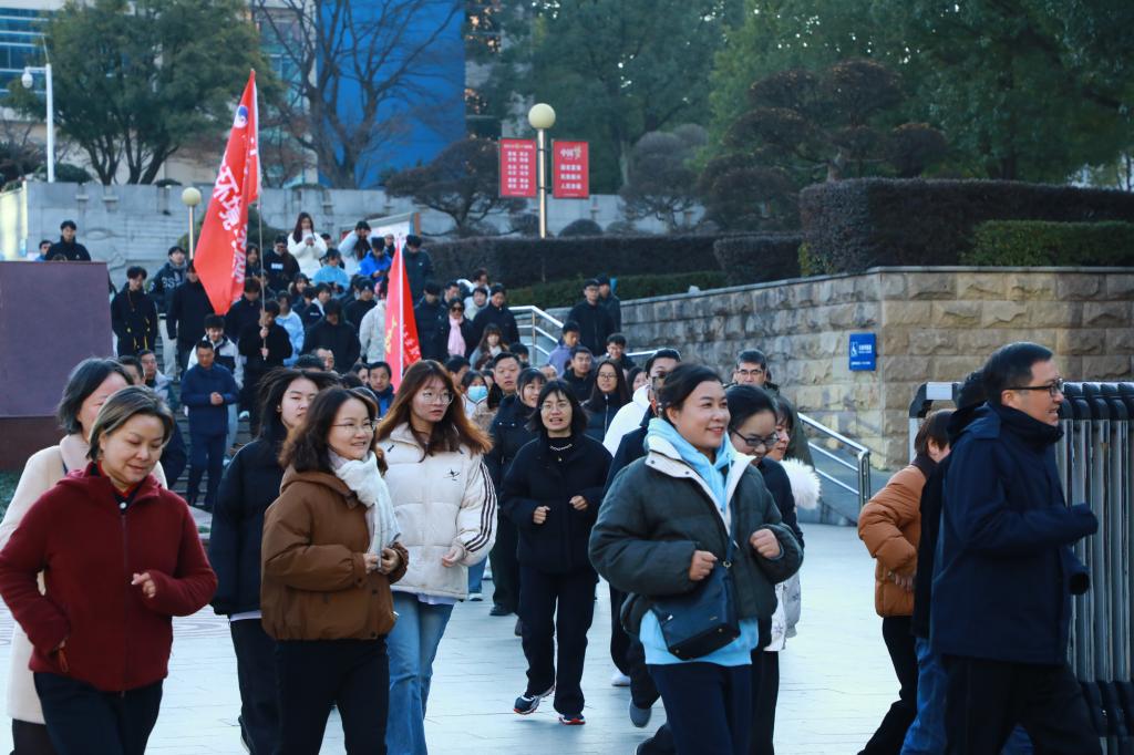 上午9:00,在学校行政楼门口,约400名师生员工齐聚在明德广场,旗帜招展、气氛热烈。校领导李海伦、毛义忠、胡昌龙、郑妍妍、刘堰兵出席起跑仪式。